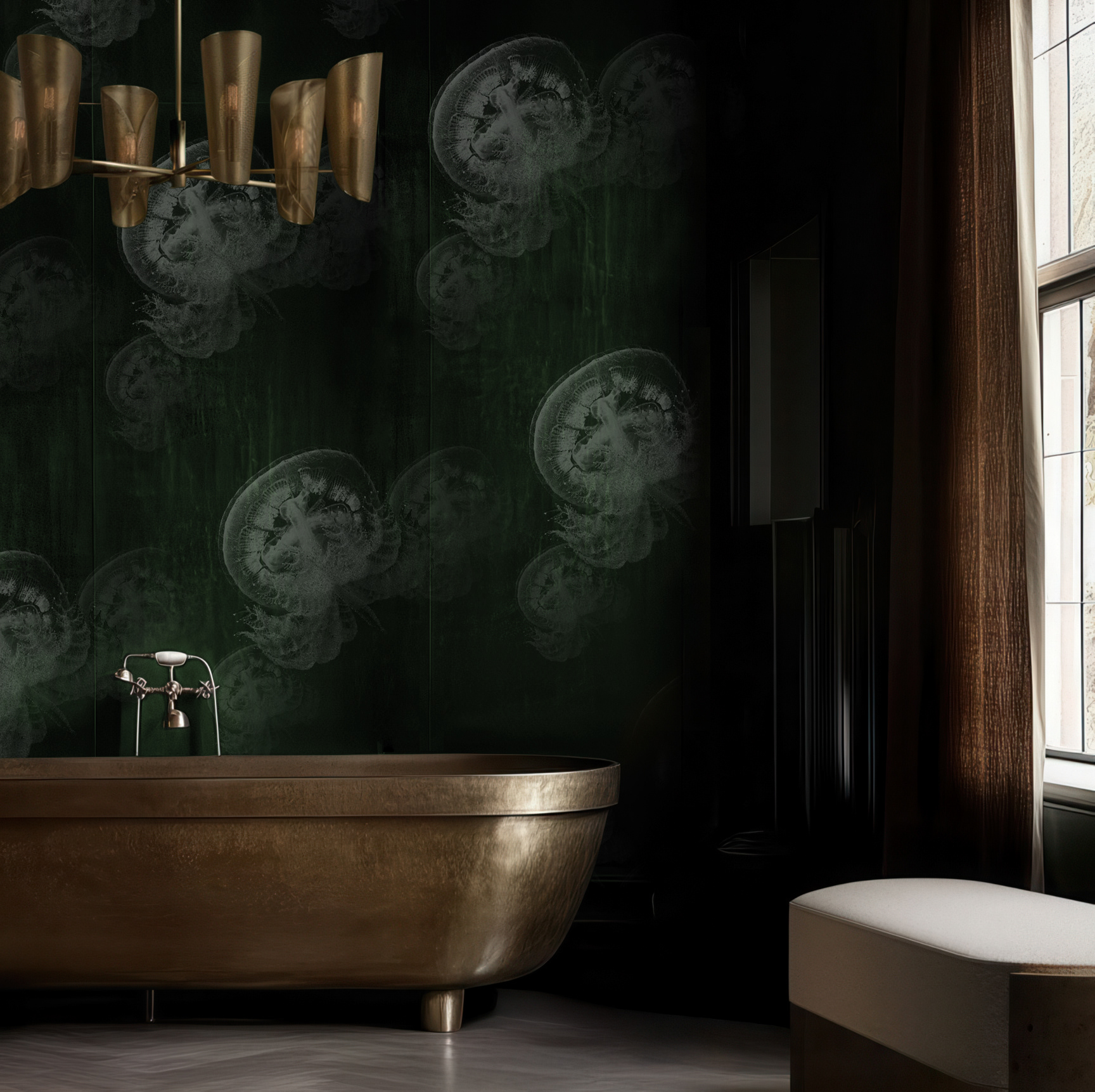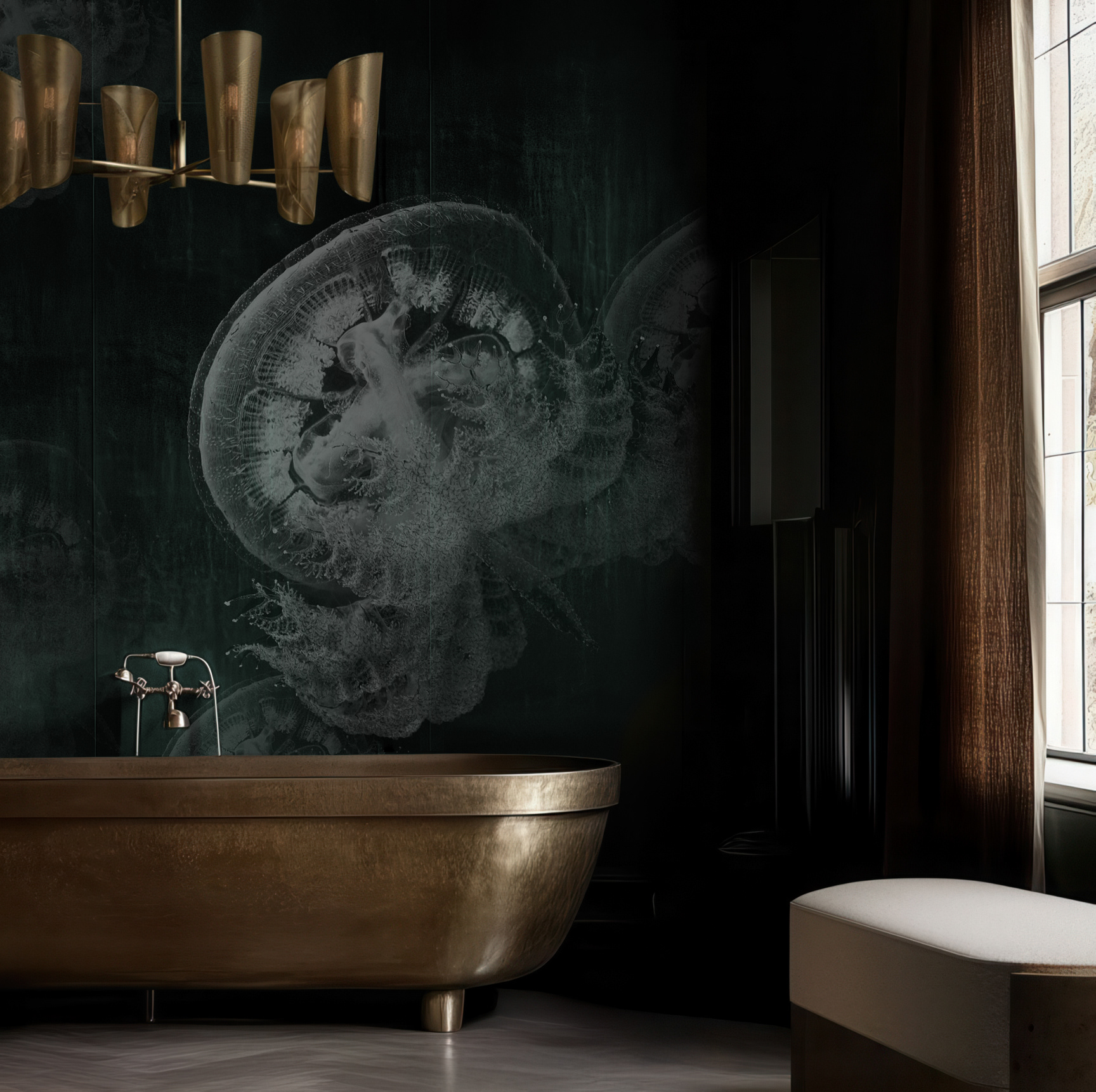 Ethereal and fluid, translucent jellyfish float across a deep, immersive backdrop. A work that captures lightness in motion, designed to infuse spaces with serenity and understated drama.