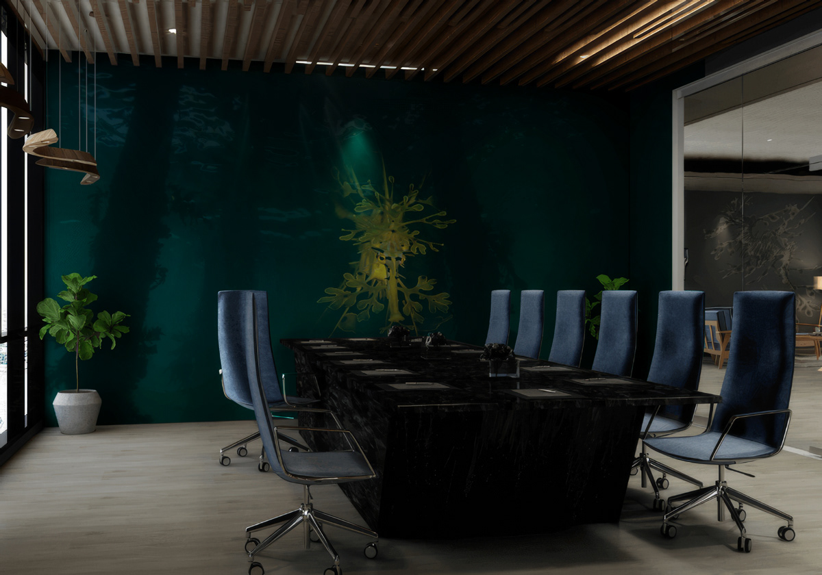 This design transforms a traditional boardroom into an immersive, biophilic statement space. The deep green tones and glowing silhouette of a leafy seadragon evoke the quiet energy of underwater movement, bringing depth, calm, and focus into the built environment. Designed for executive and client-facing interiors, it balances organic inspiration with architectural precision—ideal for brands seeking a distinctive visual identity that fuses nature, artistry, and modern design.