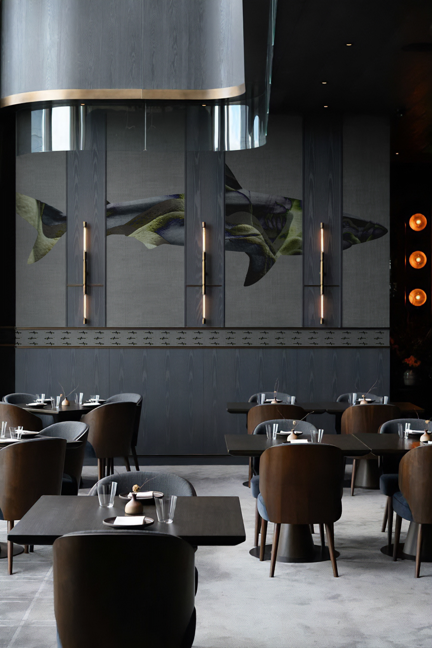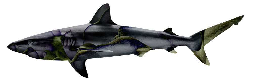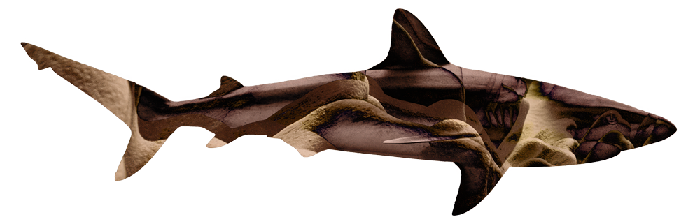 Dark aquatic hues and layered textures conjure depth and mystery. The shark becomes a vessel of hidden movement and commanding stillness.