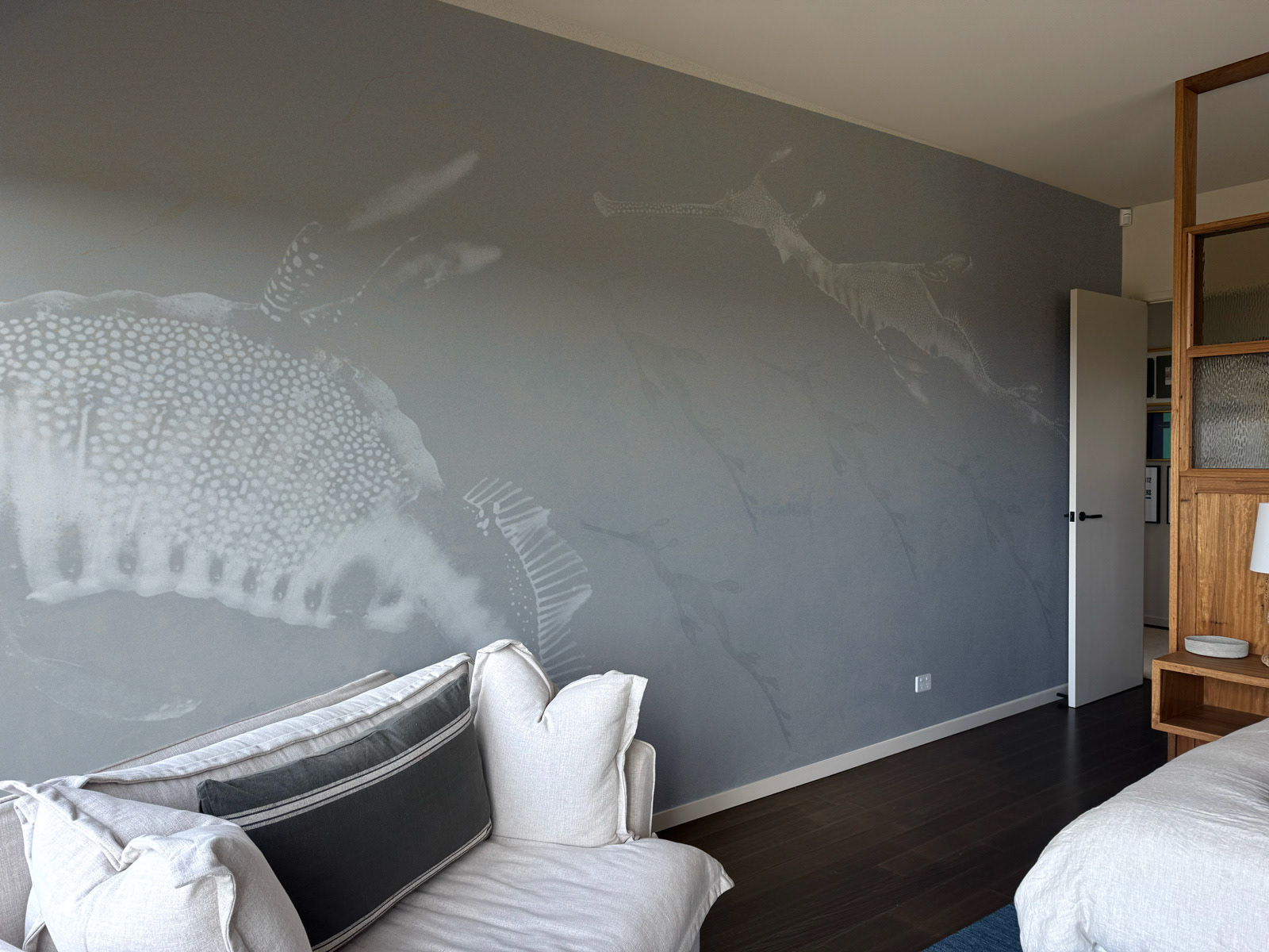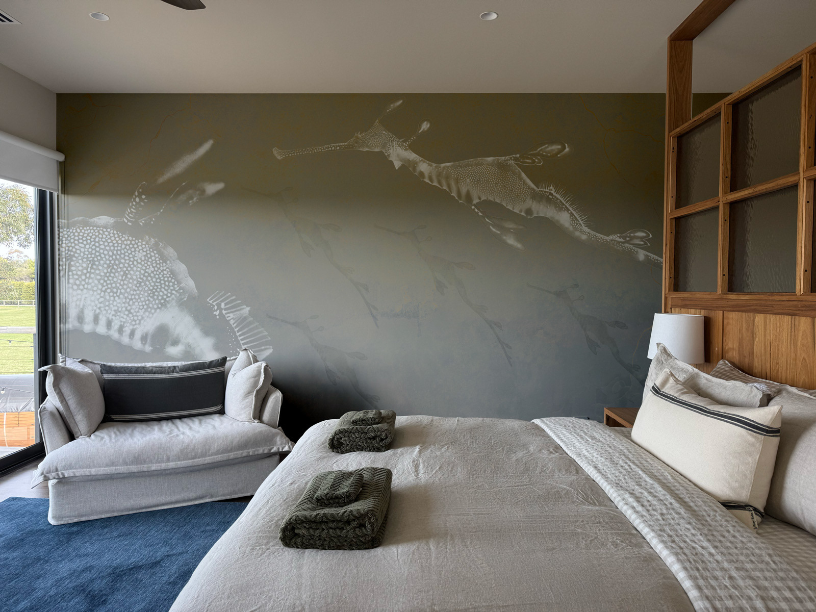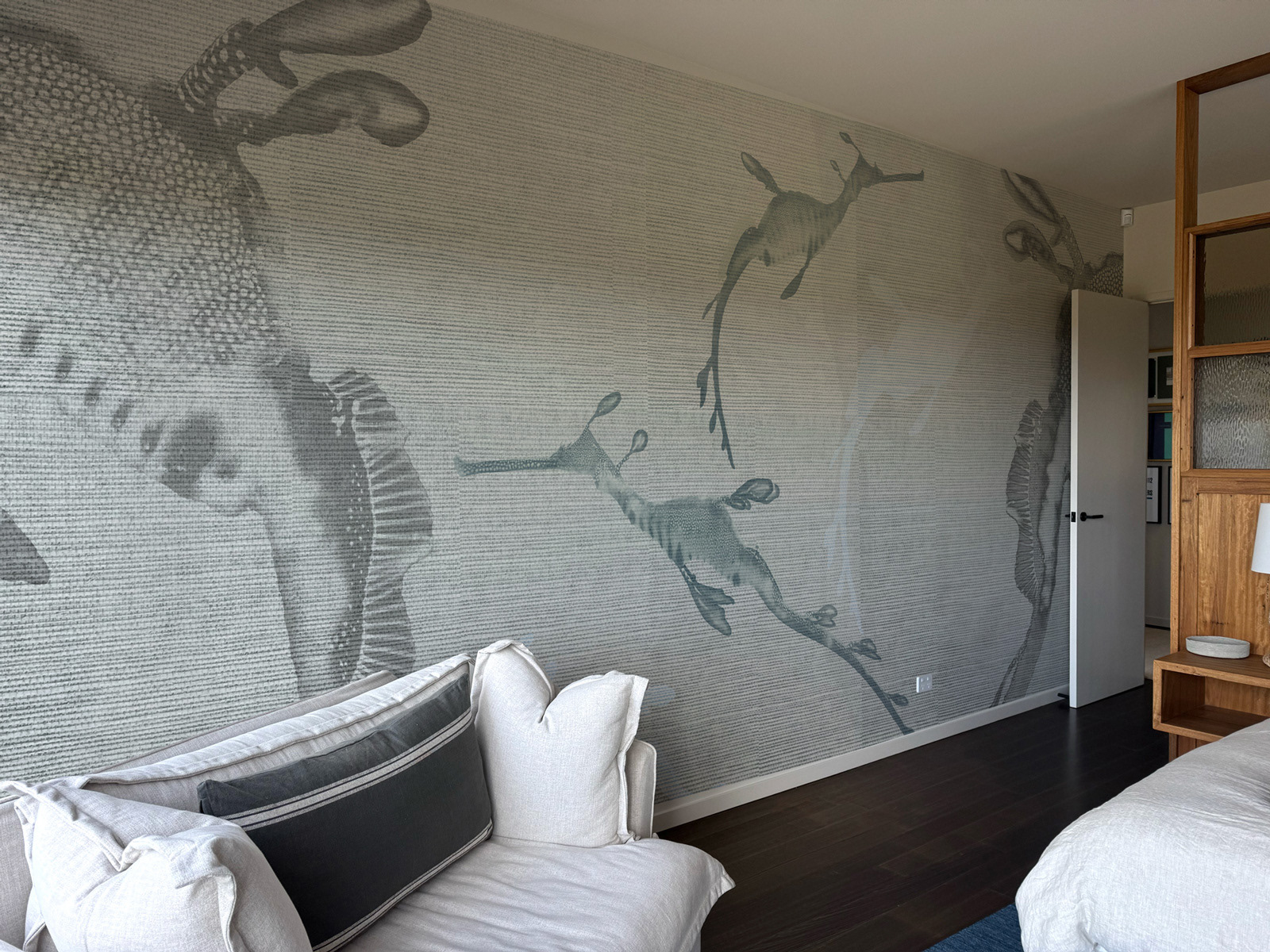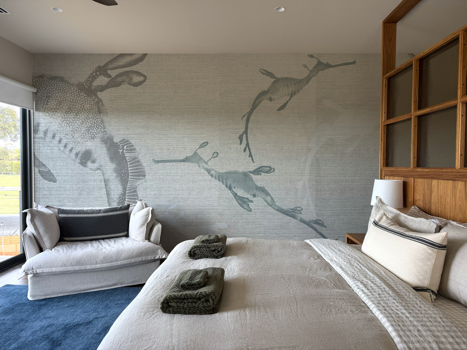 When we began designing this custom wallpaper mural, we wanted to capture that same quiet magic that drifts beneath the surface here. Every image you see was photographed in the bay itself — layered, softened, and reimagined to bring that underwater calm into the room.